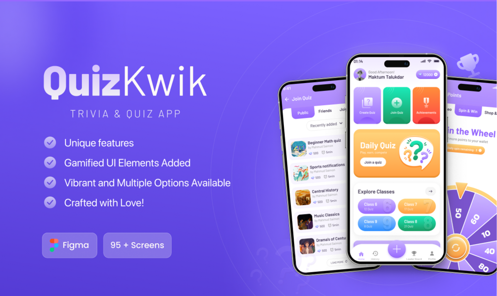 Quizkwik is a trivia and Quiz sharing app. It has beautiful UI design that leads toward engaging and fantastic quiz journey. User can also earn reward with playing "Spin n Win" and Watching video Ads. User can generate reward and upgrade tier with affiliated product purchase. User can also compare progress with leaderboard scores. After all the app generate lot of user engagement and traction through playful gamified UI.